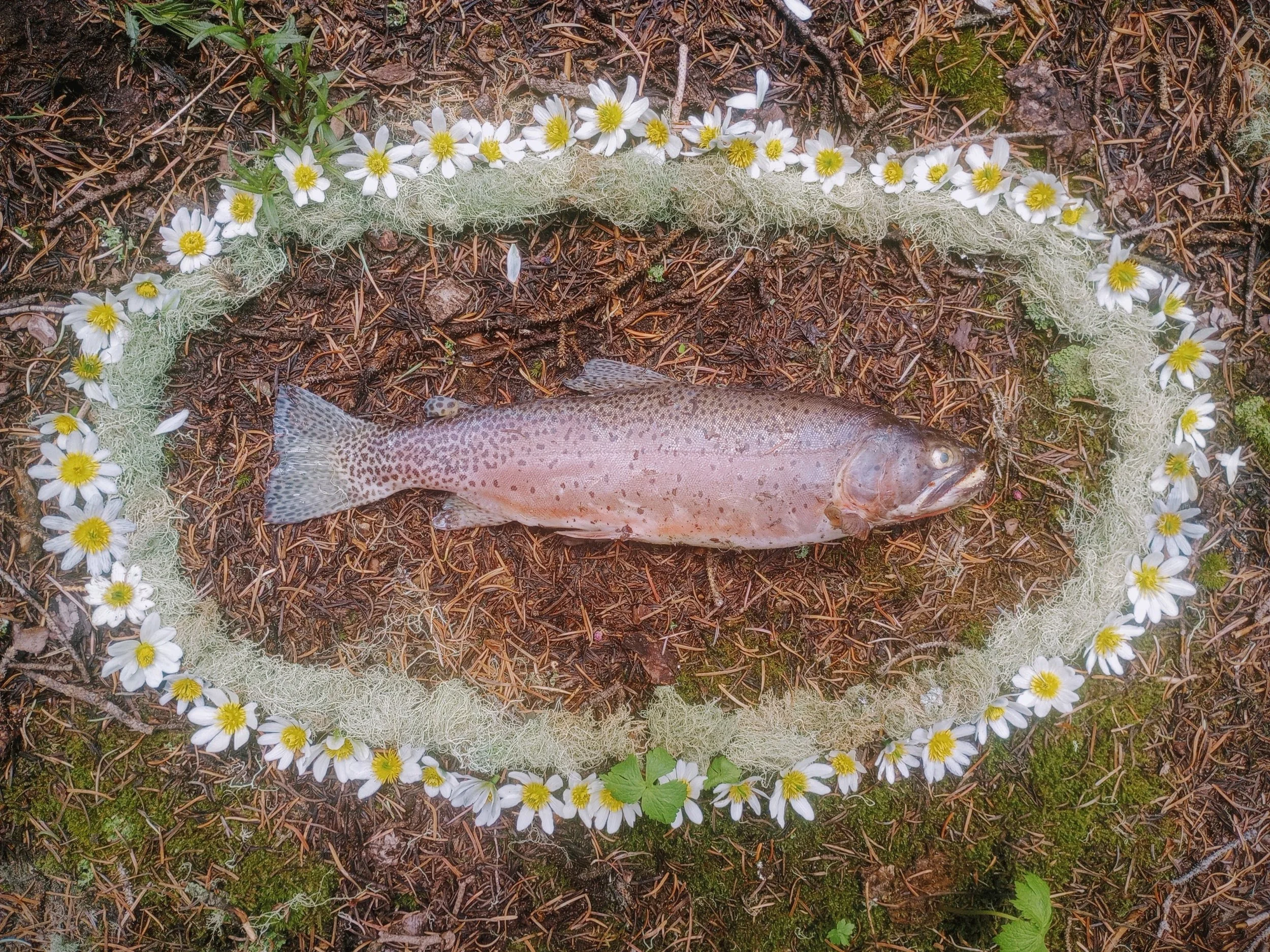 Part of my practice, more on the spiritual than art side, is to create shrines honoring the dead creatures that I cross paths with on the road and on the trail. I typically carry their bodies away from the car and foot traffic to a peaceful place, lay them down in a respectful position, and adorn around them with the natural materials found in the area. After I feel good about their new resting place, I talk and sing to them